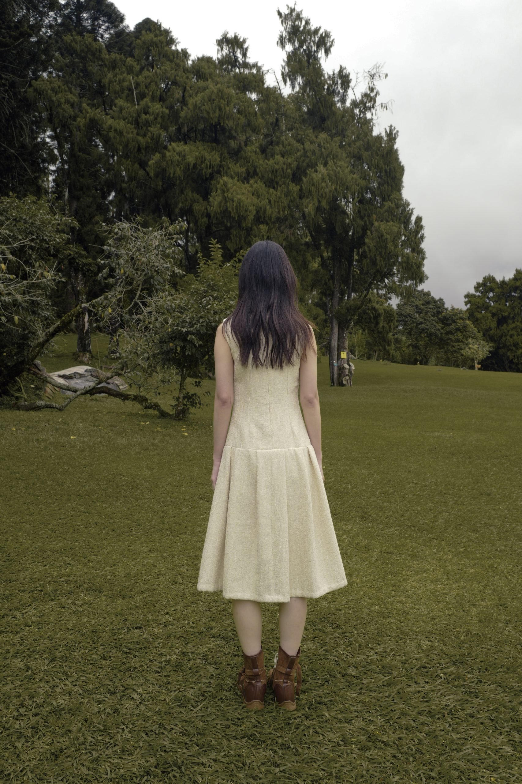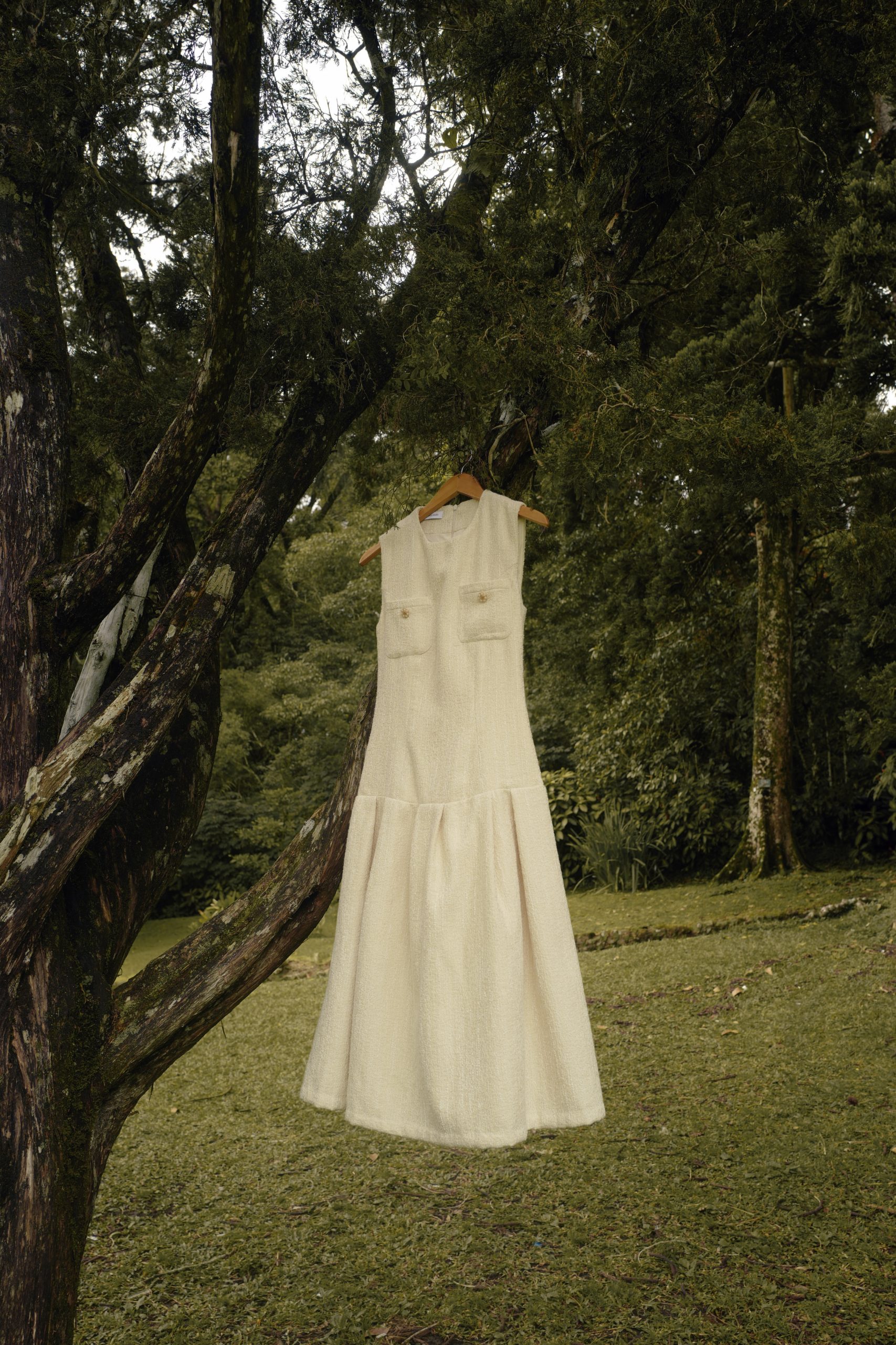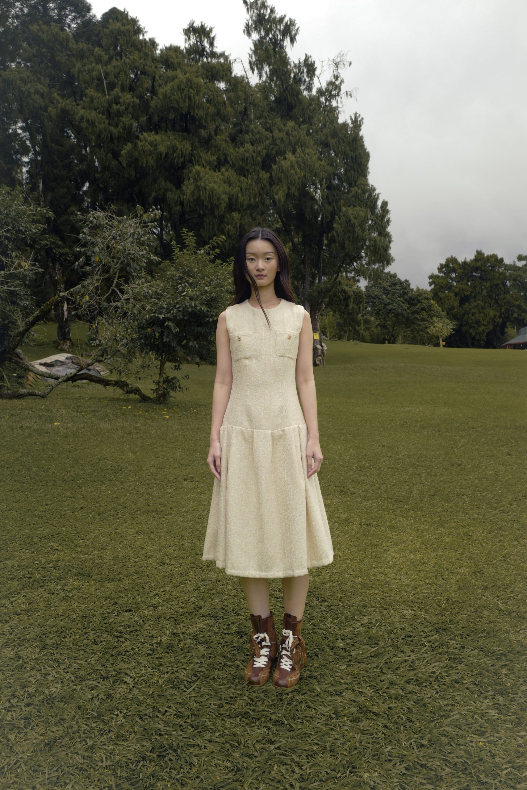 Bridget Tweed Midi Dress is crafted from fine tweed, offering a sophisticated texture. The dress features a beautifully fitted bodice with an elegant scoop neckline and a dropped waist, flowing into a softly pleated skirt. A timeless silhouette perfect for any refined occasion.