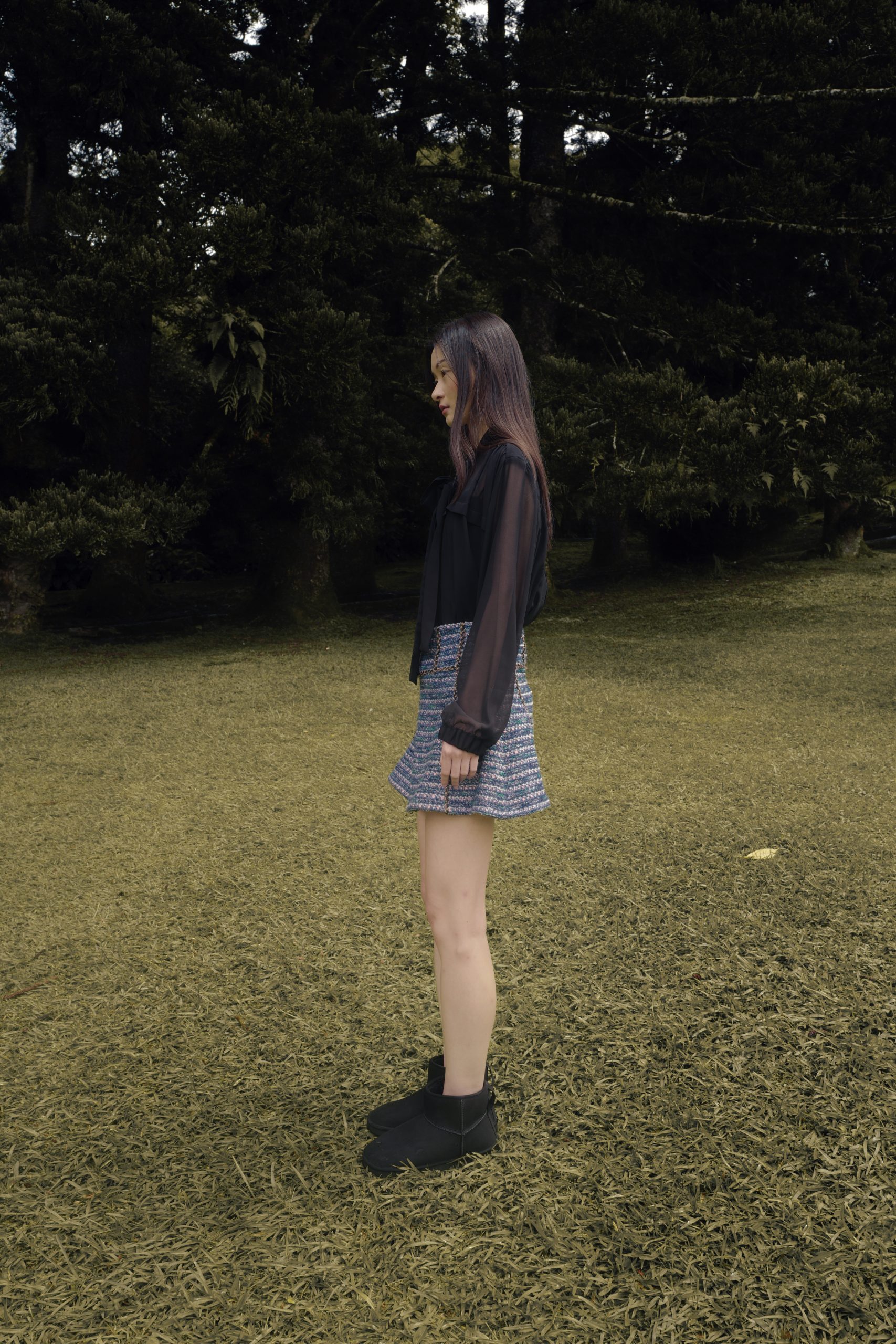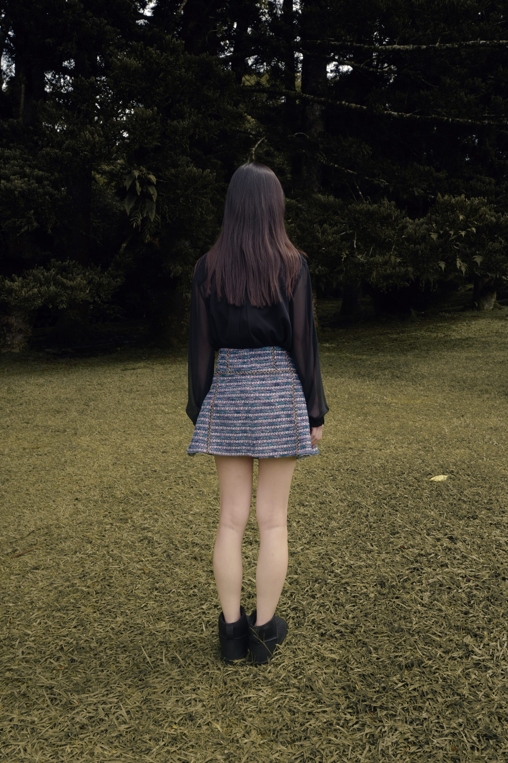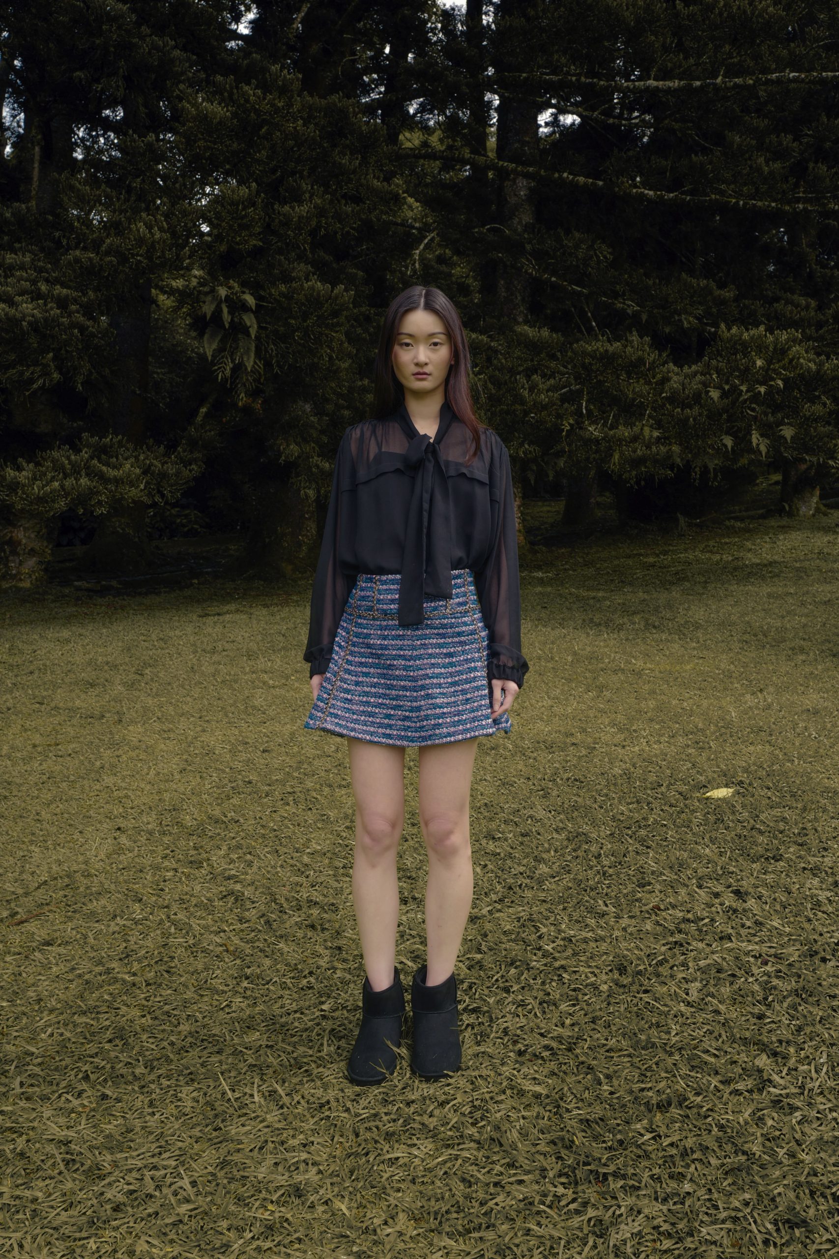 Gabriela Tweed Mini Skirt is a chic, modern staple. Designed to sit low on the waist, it features a slight fluted mini-length silhouette. This piece is elegantly traced with intricate tweed trims throughout. Pair it with the matching oversized vest for a perfectly coordinated look.