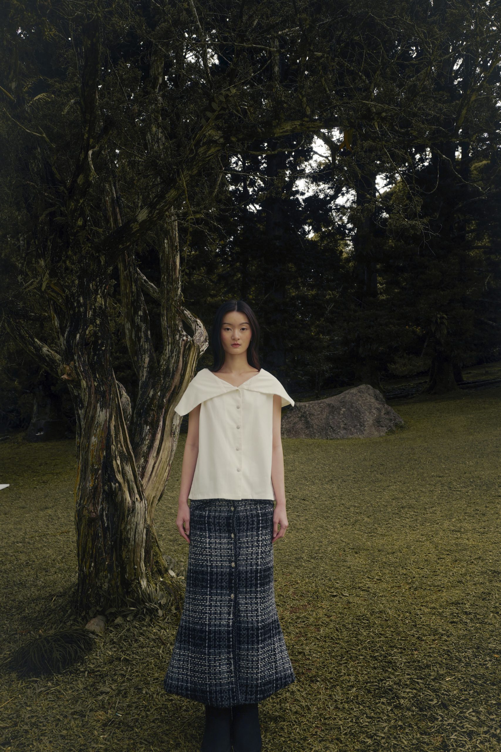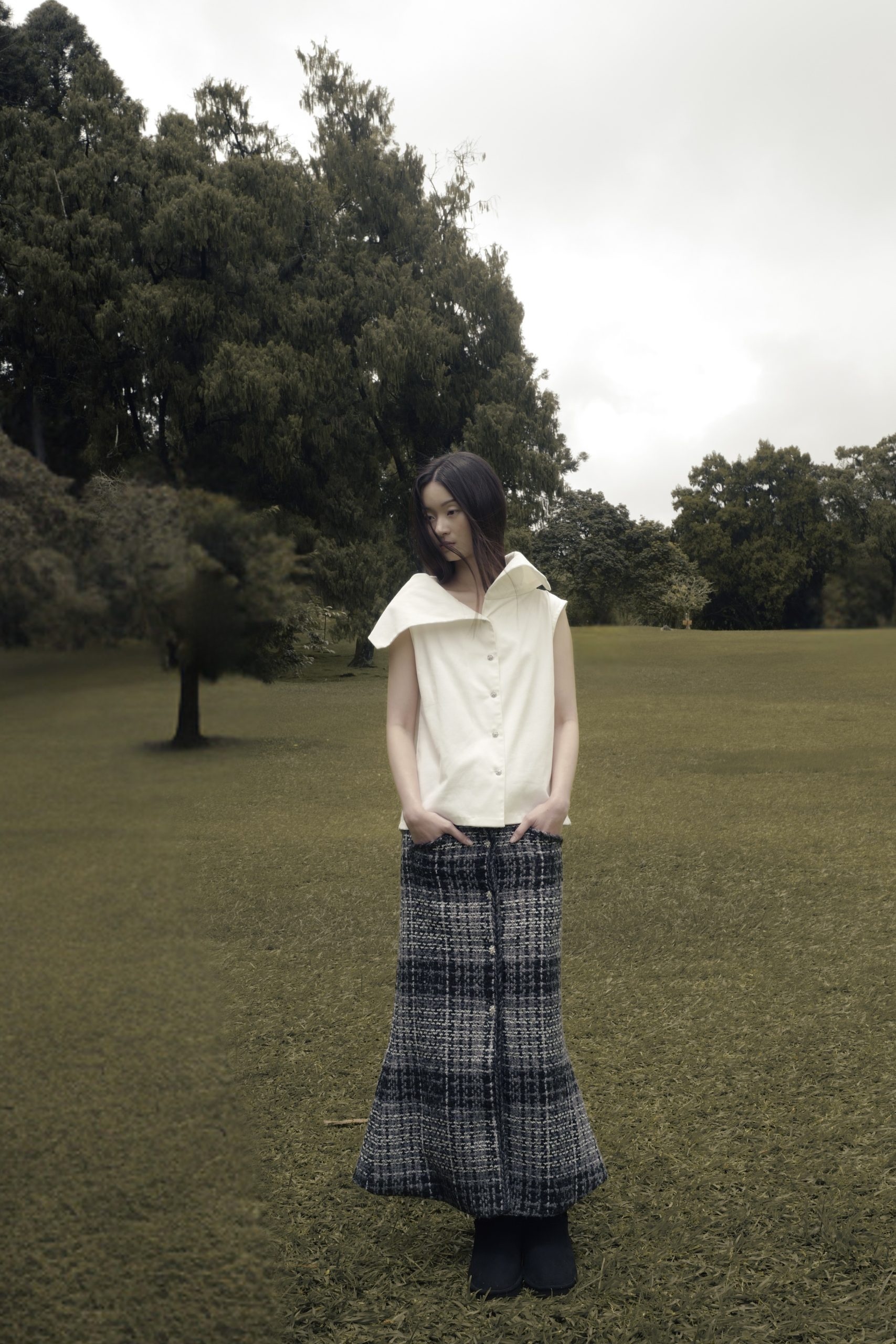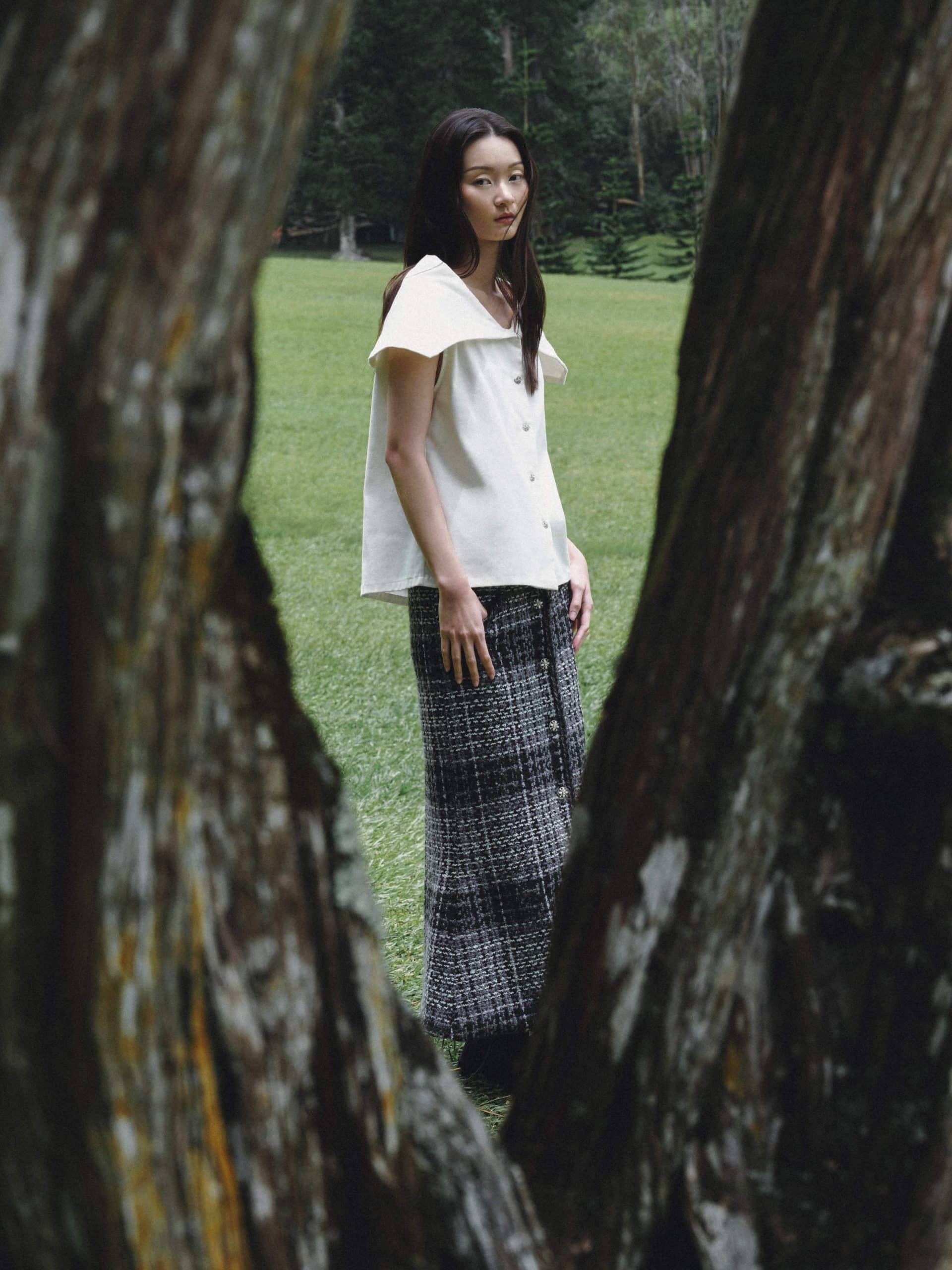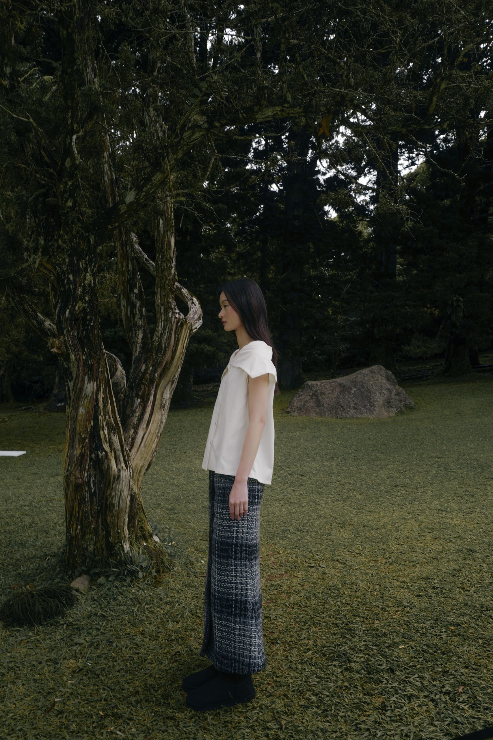 A sophisticated staple in a soft, fluffy tweed. Sitting just below the natural waist Margot Tweed Maxi Skirt is designed with a subtle mermaid silhouette and two front pockets. Adorned with delicate braided trims throughout for an elegant finish. Complete the look with the coordinating Margot Tweed Jacket in Grey.